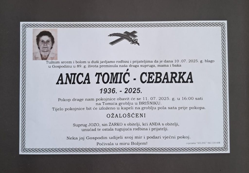 U četvrtak, 10. srpnja 2025. godine, u 89. godini života blago u Gospodinu preminula je Anica Tomić – Cebarka.