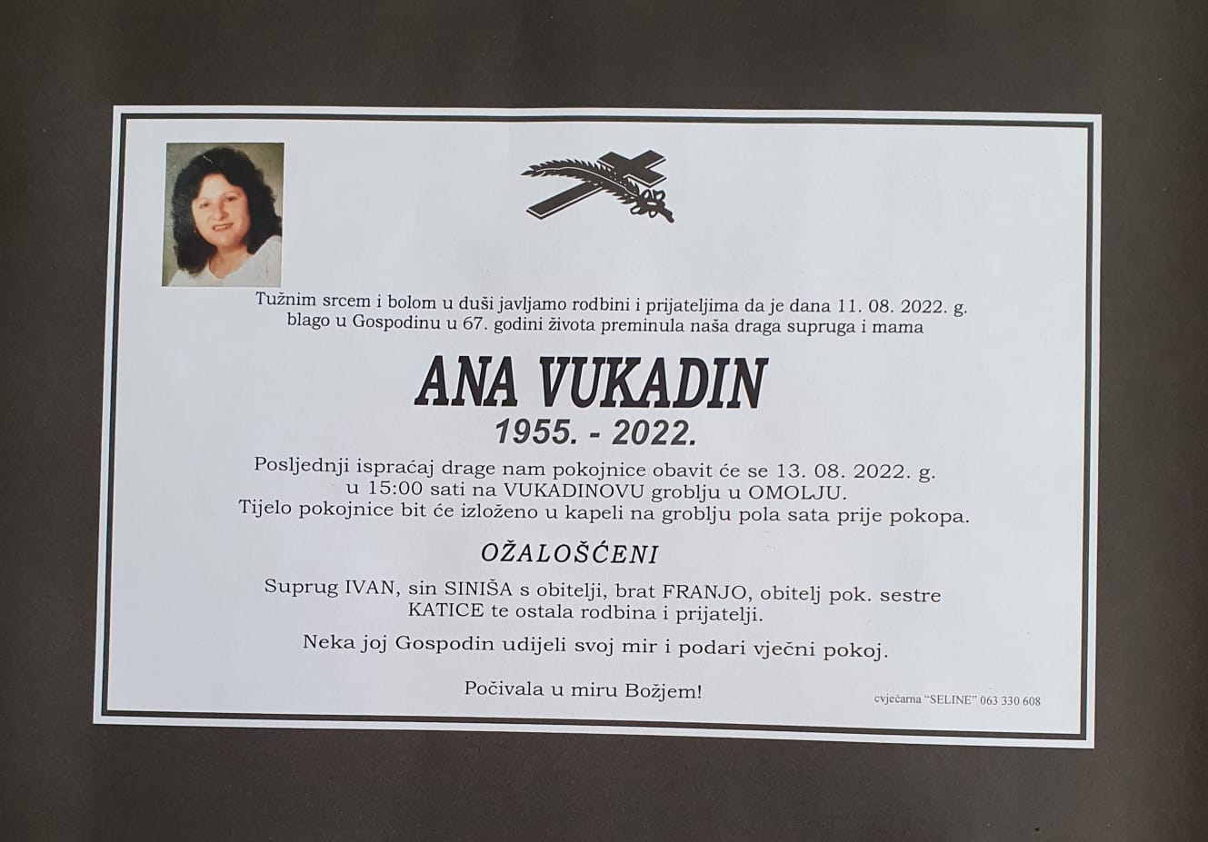 Posljednji ispraćaj bit će u subotu, 13. kolovoza u 15 sati na Vukadinovu groblju u Omolju.