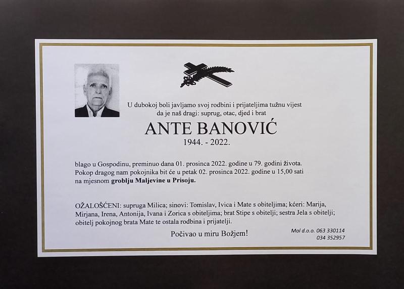 U četvrtak, 1. prosinca 2022. godine u 79. godini života blago u Gospodinu preminuo je Ante Banović.