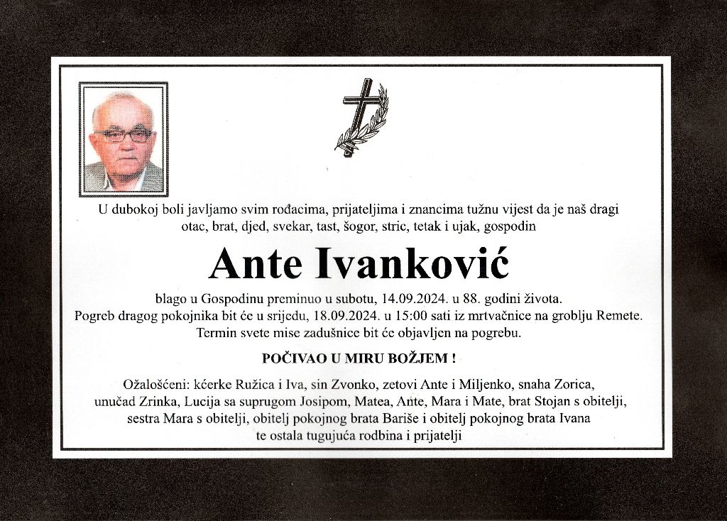 U subotu, 14. rujna u 88. godini života blago u Gospodinu preminuo je Ante Ivanković.