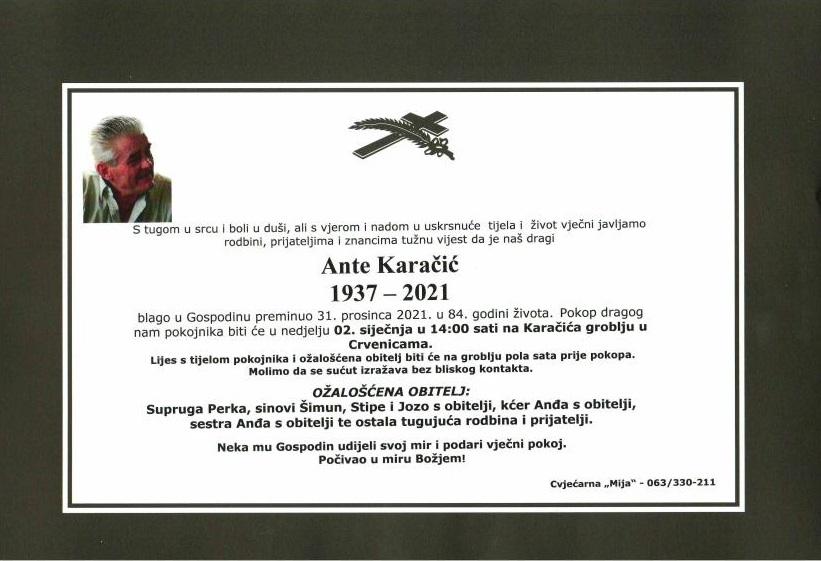 U petak, 31. prosinca u 84. godini života blago u Gospodinu preminuo je Ante Karačić.