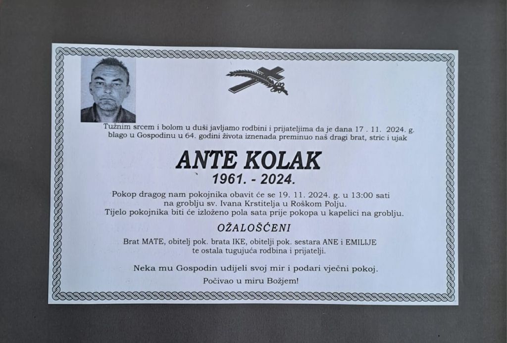 U nedjelju, 17. studenog 2024. godine iznenada je u 64. godini života blago u Gospodinu preminuo Ante Kolak.