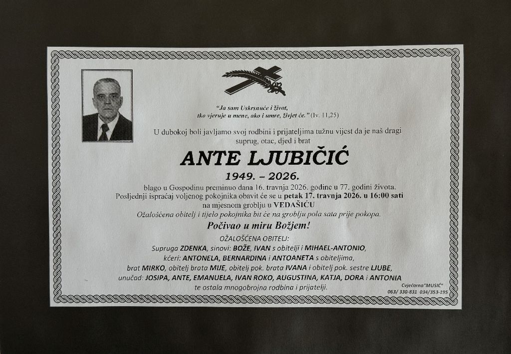 U četvrtak, 16. travnja 2026. godine u 77. godini života blago u Gospodinu preminulo je Ante Ljubičić.
