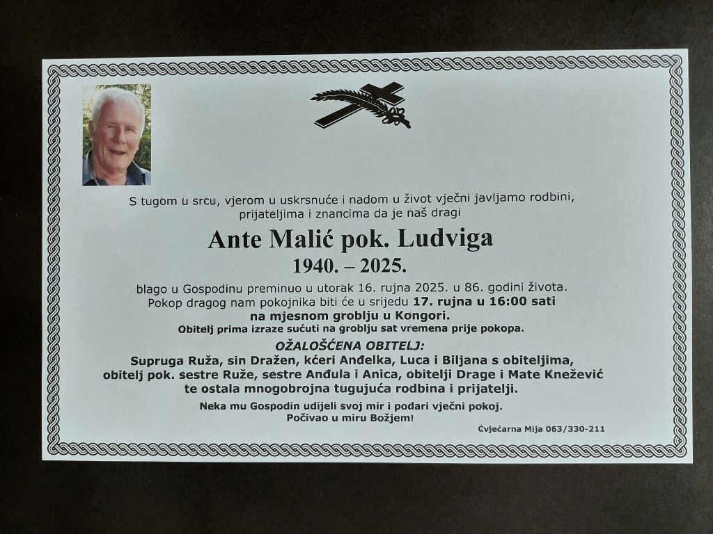 U utorak, 16. rujna u 86. godini života blago u Gospodinu preminuo je Ante Malić, pok. Ludviga.