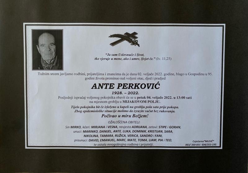 U srijedu, 2. veljače u 95. godini blago u Gospodinu preminuo je Ante Perković.