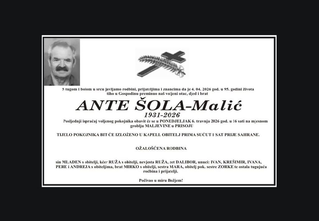 U subotu, 4. travnja 2026. godine u 95. godini života blago u Gospodinu preminuo je Ante Šola – Malić.