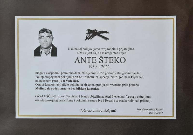 U petak, 28. siječnja u 84. godini života blago u Gospodinu preminuo je Ante Šteko.