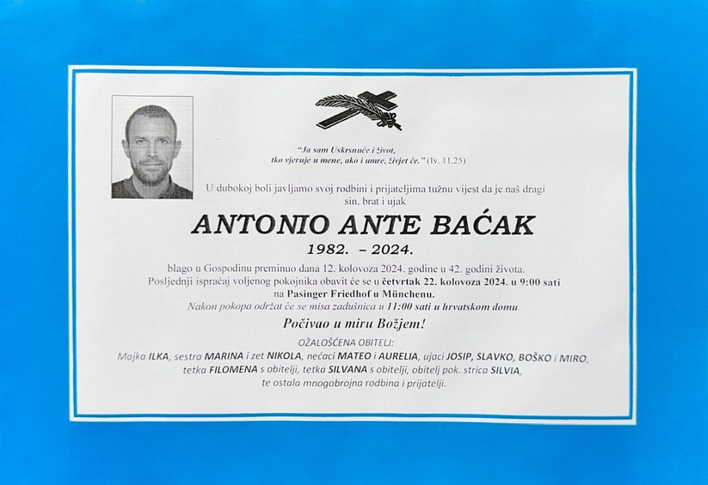 U ponedjeljak, 12. kolovoza 2024. godine u 42. godini života blago u Gospodinu preminuo je Antonio Ante Baćak.