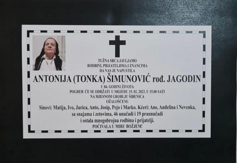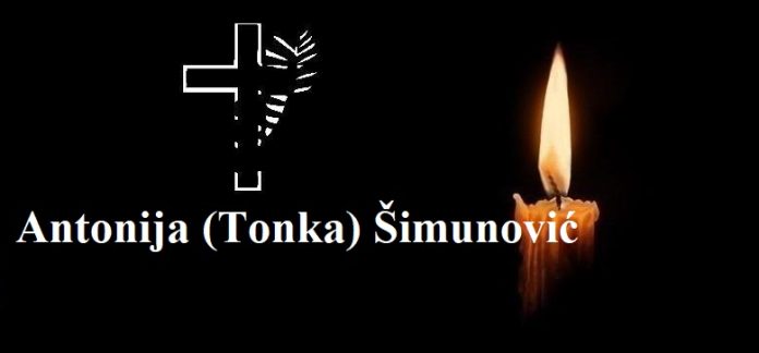 U 84. godini života blago u Gospodinu preminula je Antonija (Tonka) Šimunović, rođ. Jagodin.