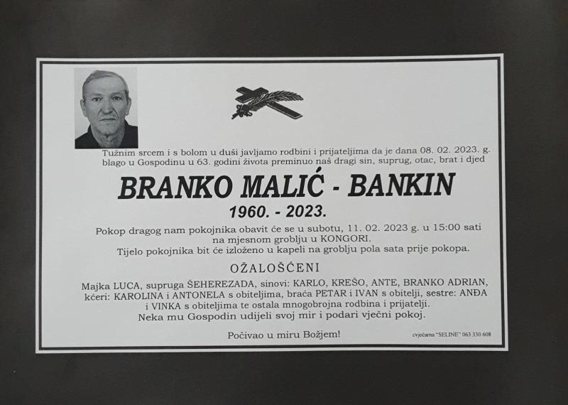 U srijedu, 8. veljače 2023. u 63. godini života blago u Gospodinu preminuo je Branko Malić – Bankin.