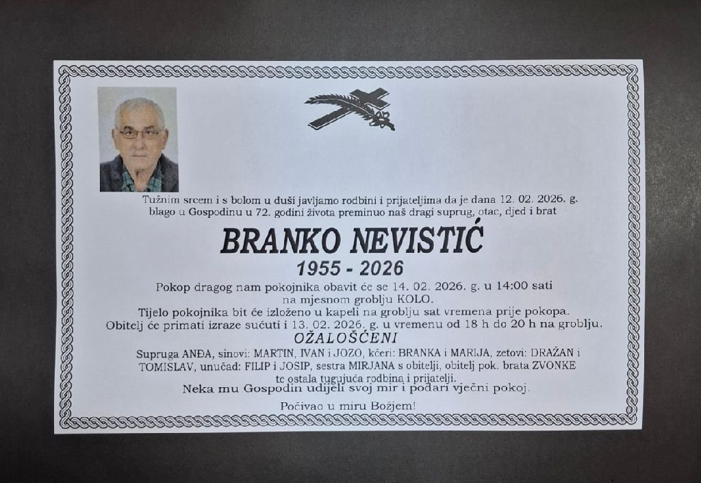 U četvrtak, 12. veljače 2026. godine u 72. godini života blago u Gospodinu preminuo je Branko Nevistić.