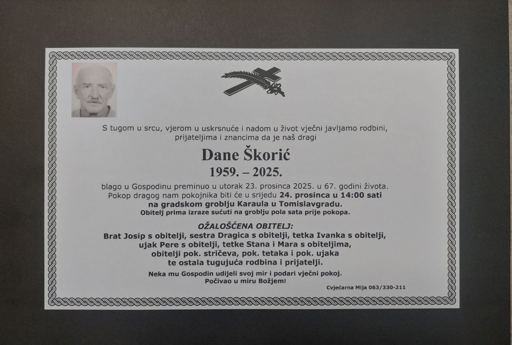 Posljednji ispraćaj bit će u srijedu, 24. prosinca 2025. godine u 14 sati na gradskom groblju Karaula u Tomislavgradu.