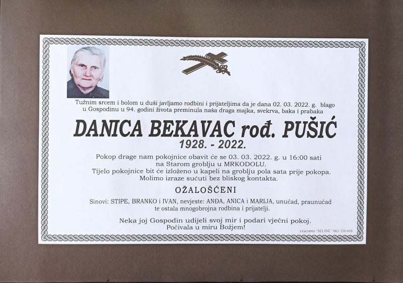 U srijedu, 2. ožujka u 94. godini života blago u Gospodinu preminula je Danica Bekavac – rođ. Pušić.