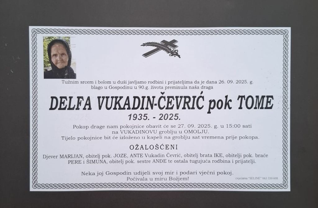 Posljednji ispraćaj bit će u subotu, 27. rujna 2025. godine u 15 sati na Vukadinovu groblju u Omolju.