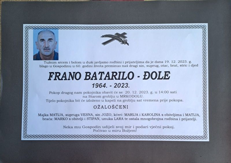 U utorak, 19. prosinca u 60. godini života blago u Gospodinu preminuo je Frano Batarilo – Đole.