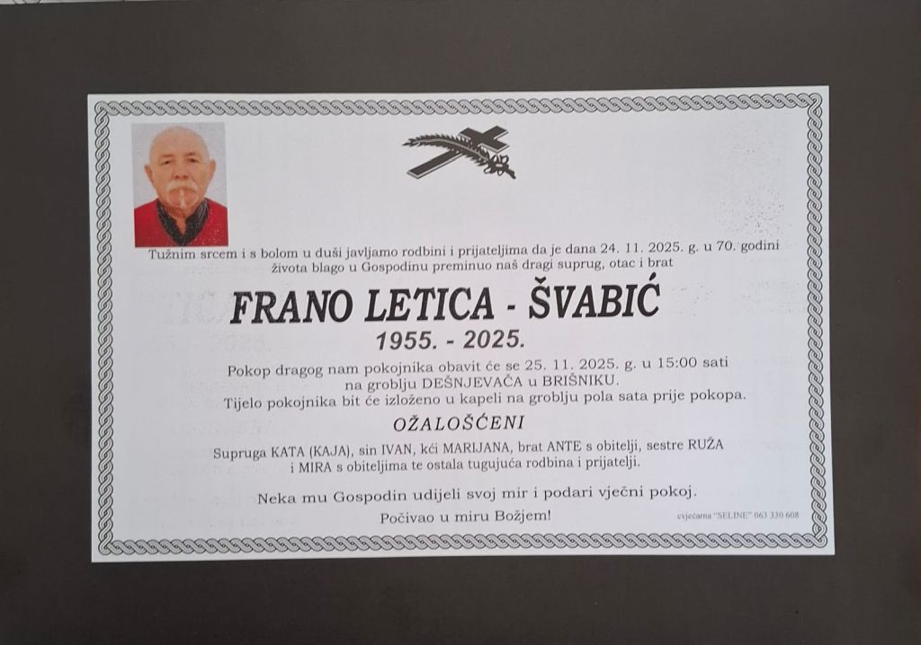 U ponedjeljak, 24. studenog 2025. godine u 70. godini života blago u Gospodinu preminuo je Frano Letica – Švabić.