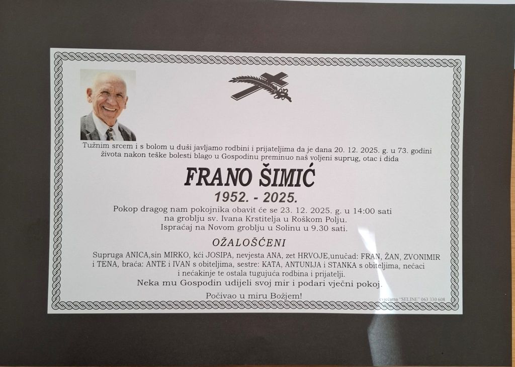 U subotu, 20. prosinca u 73. godini života, nakon teške bolesti, blago u Gospodinu preminuo je Frano Šimić.
