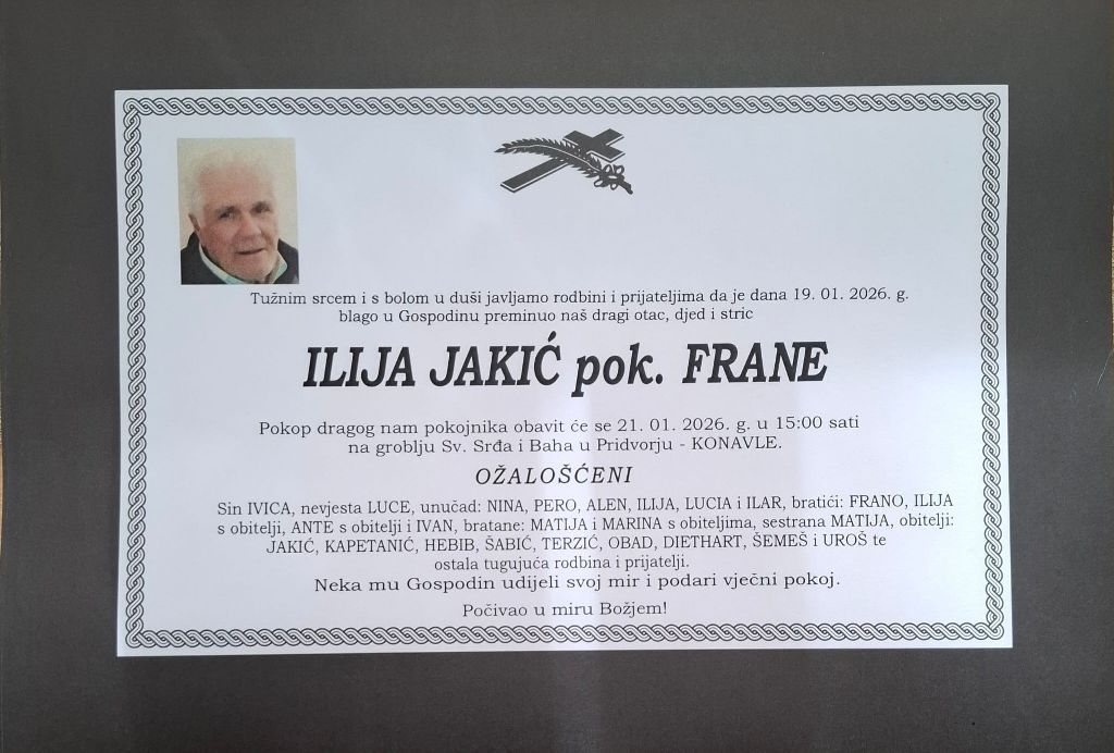 U ponedjeljak, 19. siječnja 2026.. blago u Gospodinu preminuo je Ilija Jakić pok. Frane.
