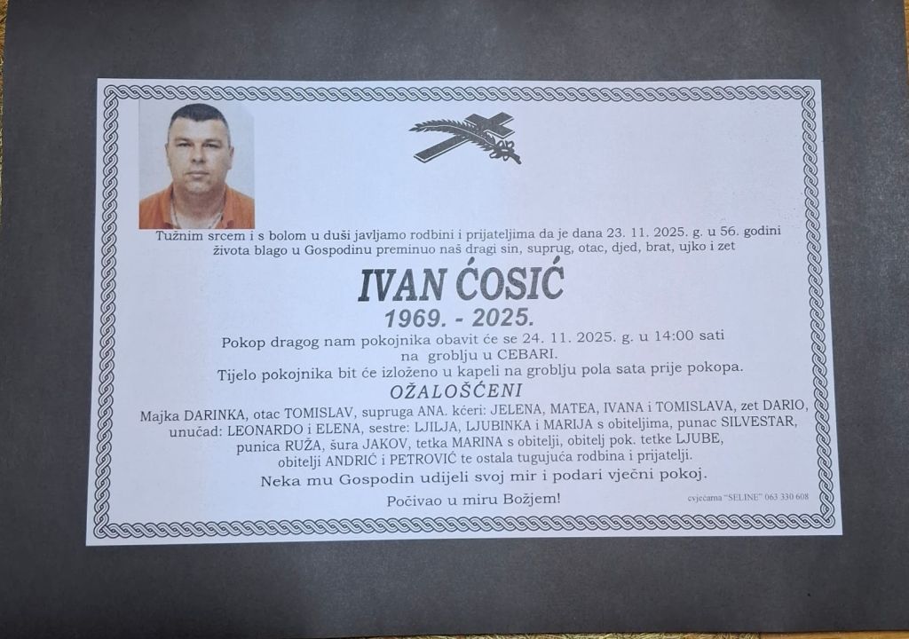U nedjelju, 23. studenog 2025. godine u 56. godini života blago u Gospodinu preminuo je Ivan Ćosić.