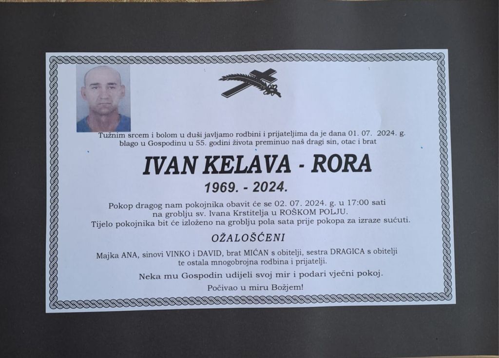 Posljednji ispraćaj bit će u utorak, 2. srpnja u 17 sati na groblju Sv. Ivana Krstitelja u Roškom Polju.
