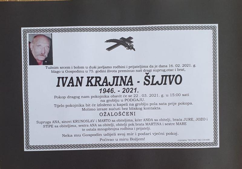 U utorak 16. ožujka, u 75. godini života blago u Gospodinu preminuo je Ivan Krajina – Šljivo.