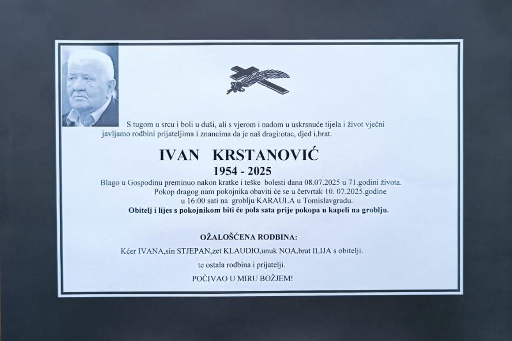 Posljednji ispraćaj bit će u četvrtak, 10. srpnja 2025. godine u 16 sati na groblju Karaula u Tomislavgradu.