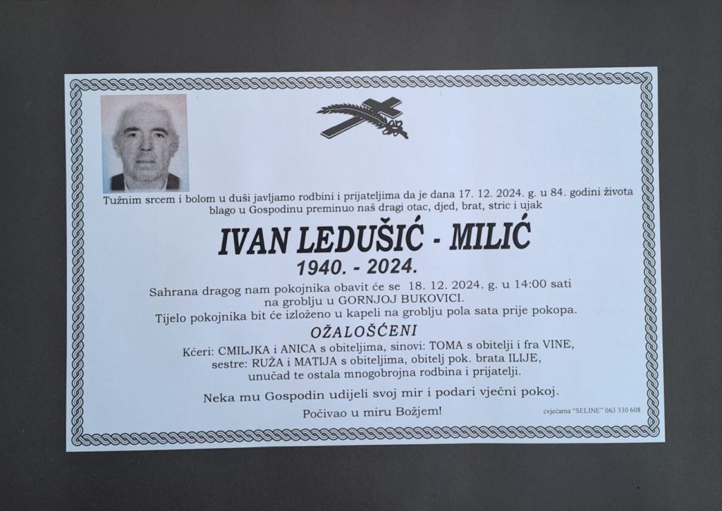 U utorak, 17. prosinca 2024. godine u 84. godini života blago u Gospodinu preminuo je Ivan Ledušić – Milić.