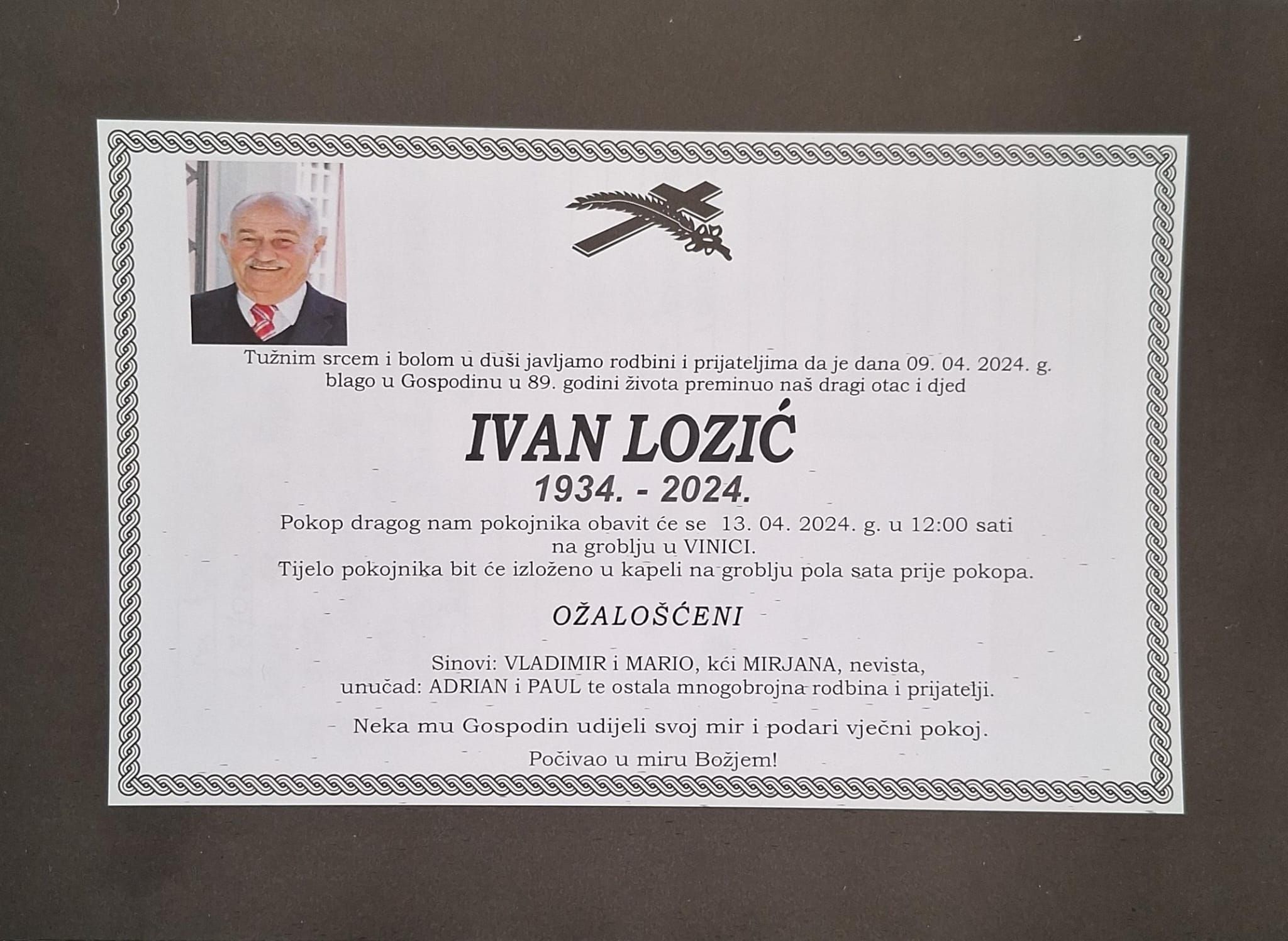 U utorak, 9. travnja 2024. godine u 89. godini života blago u Gospodinu preminuo je Ivan Lozić.