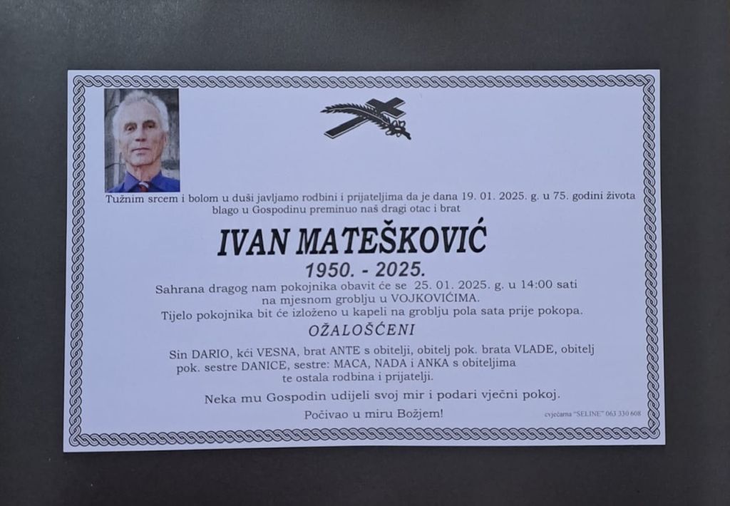 Posljednji ispraćaj bit će u subotu, 25. siječnja 2025. u 14 sati na mjesnom groblju u Vojkovićima.
