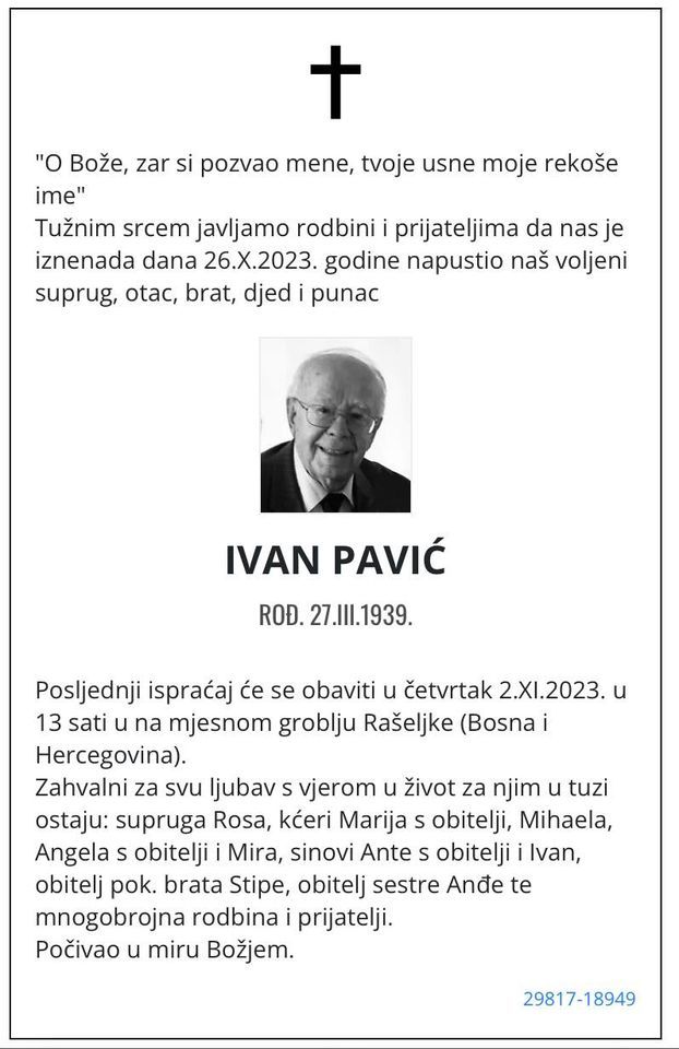 U četvrtak, 26. listopada 2023. godine u 85. godini života blago u Gospodinu preminuo je Ivan Pavić.