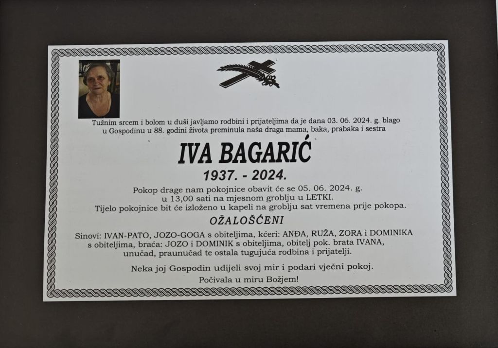 U ponedjeljak, 3. lipnja 2024. godine u 88. godini života blago u Gospodinu preminula je Iva Bagarić.