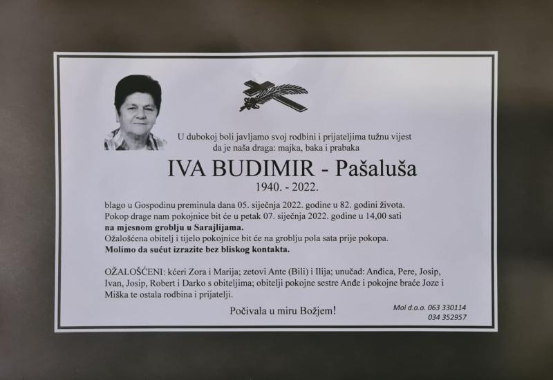 U srijedu, 5. siječnja u 82. godini života blago u Gospodinu preminula je Iva Budimir – Pašalša.
