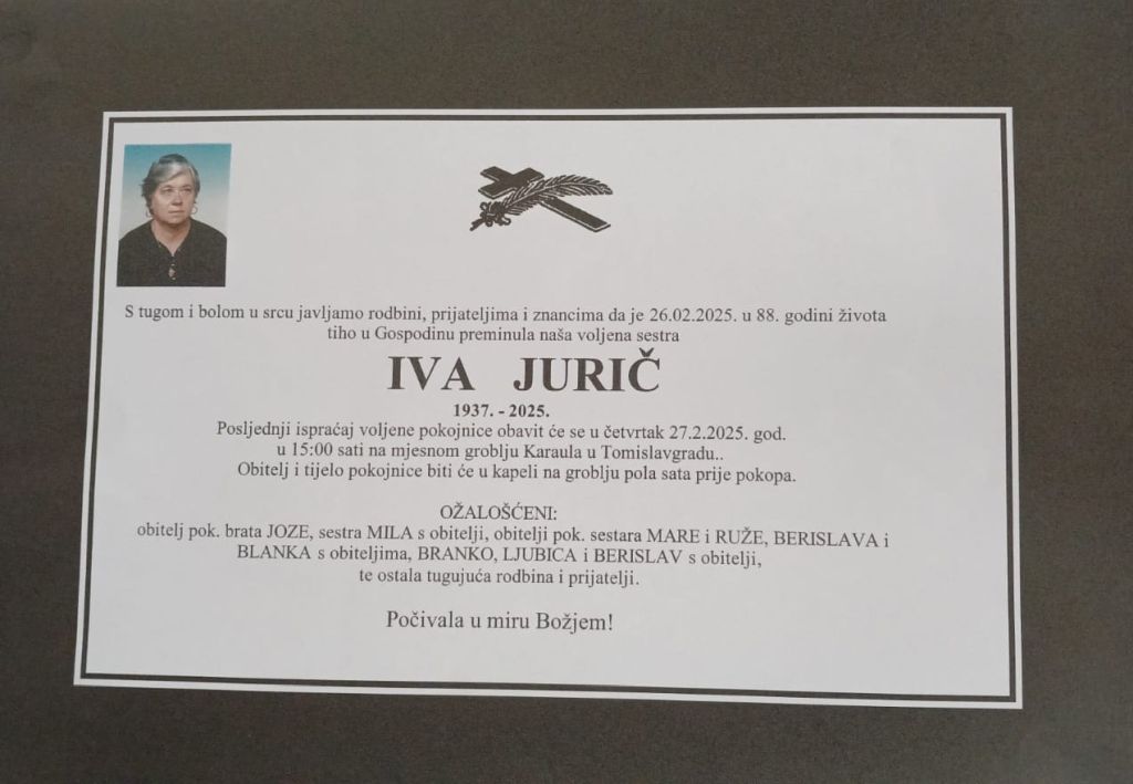 U srijedu, 26. veljače 2025. u 88. godini života blago u Gospodinu preminula je Iva Jurič.