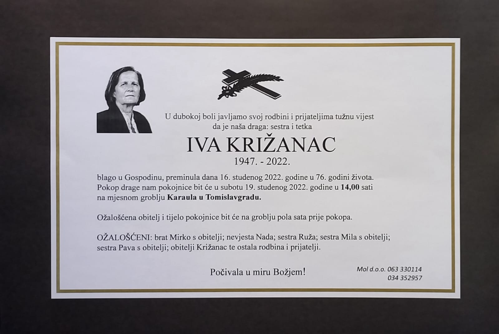 U srijedu, 16. studenog 2022. godine u 76. godini života blago u Gospodinu preminula je Iva Križanac.