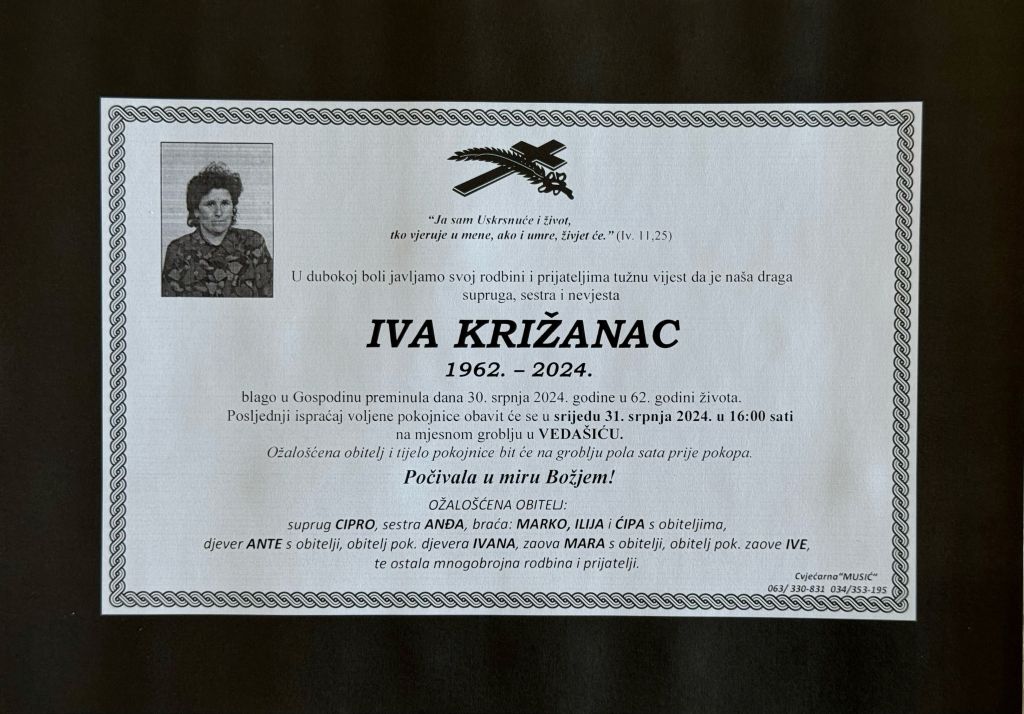 U utorak, 30. srpnja 2024. godine u 62. godini života blago u Gospodinu preminula je Iva Križanac.
