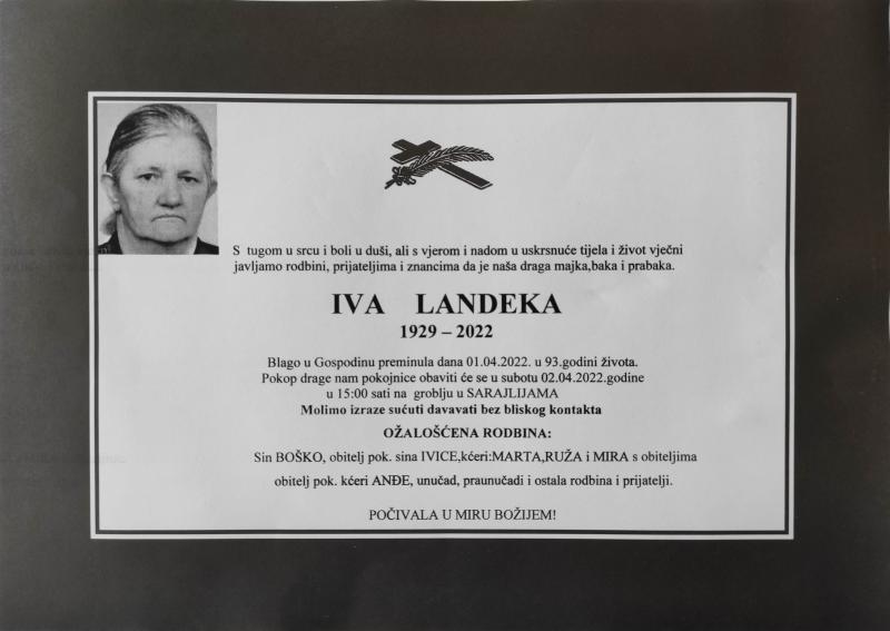 U petak, 1. travnja u 93. godini života blago u Gospodinu preminula je Iva Landeka.