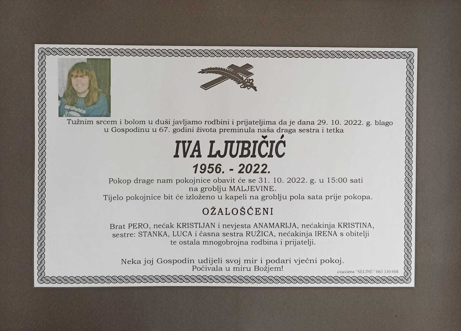 U subotu, 29. listopada u 67. godini života blago u Gospodinu preminula je Iva Ljubičić.