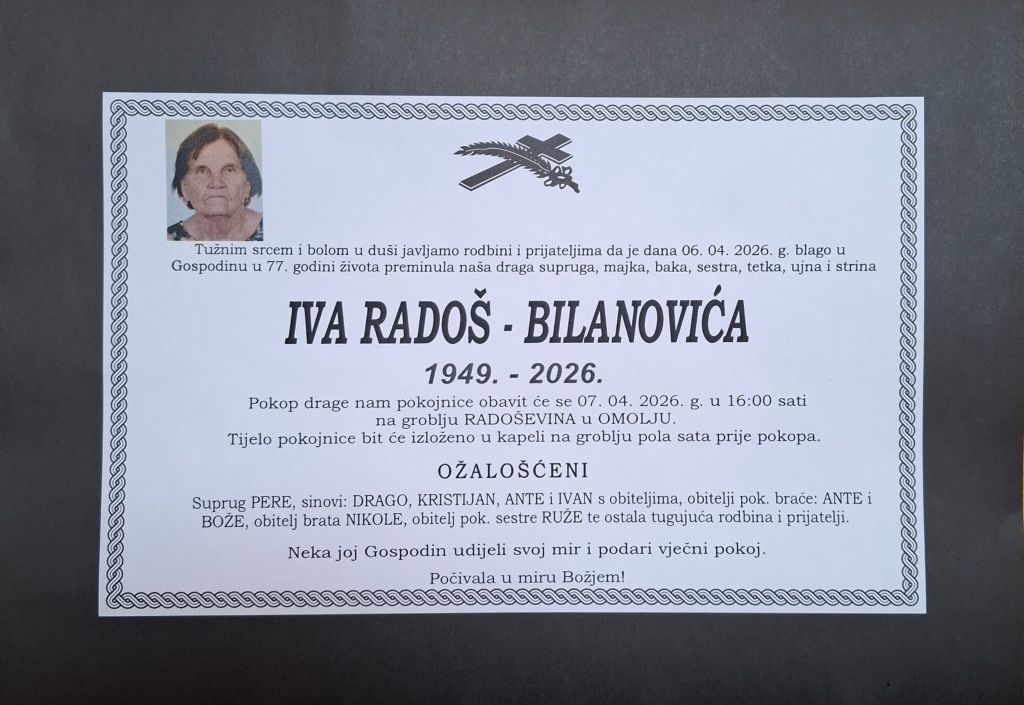 U ponedjeljak, 6. travnja 2026. godine u 77. godini života blago u Gospodinu preminula je Iva Radoš – Bilanovića.