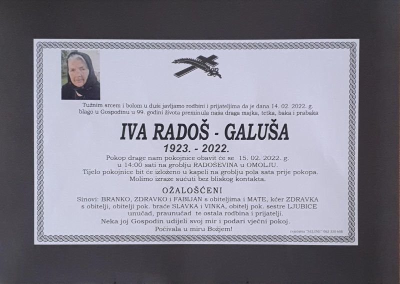 U ponedjeljak, 14. veljače u 99. godini života blago u Gospodinu preminula je Iva Radoš – Galuša.