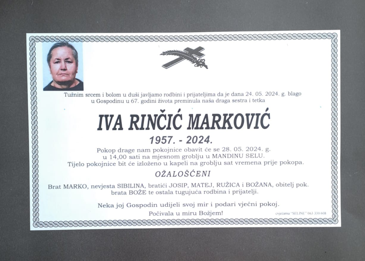 U petak, 24. svibnja u 67. godini života blago u Gospodinu preminula je Iva Rinčić Marković.