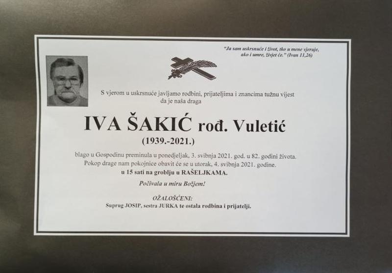 U ponedjeljak 3. svibnja, u 82. godini života blago u Gospodinu preminula je Iva Šakić.