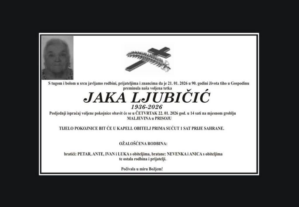 U srijedu, 21. siječnja 2026. godine, u 90. godini života blago u Gospodinu preminula je Jaka Ljubičić.