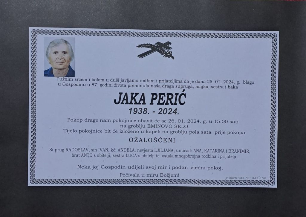 U četvrtak, 25. siječnja 2024. godine u 87. godini života blago u Gospodinu preminula je Jaka Perić.