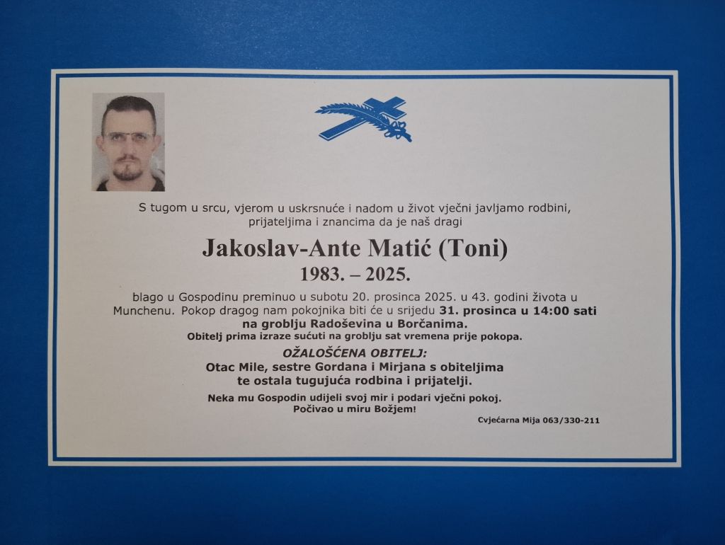 U subotu, 20. prosinca 2025. u 43. godini života blago u Gospodinu preminuo je Jakoslav-Ante Matić (Toni).