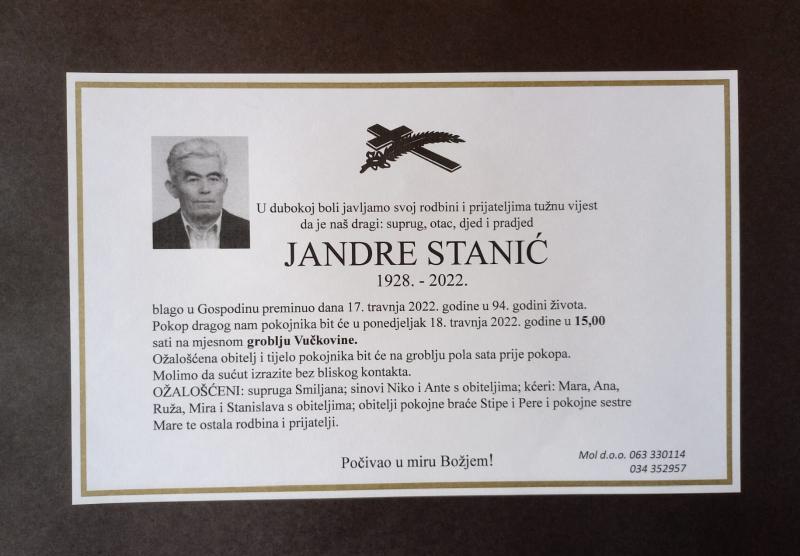 Na Uskrs, 17. travnja u 94. godini života blago u Gospodinu preminuo je Jandre Stanić.