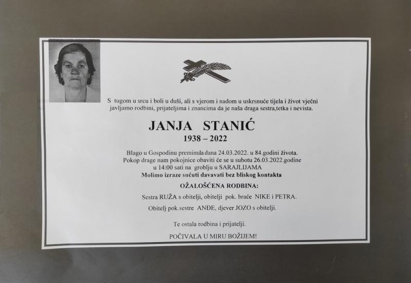 U četvrtak, 24. ožujka u 84. godini života blago u Gospodinu preminula je Janja Stanić.