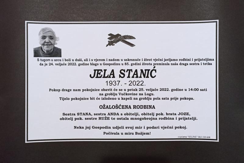U četvrtak, 24. veljače u 85. godini života blago u Gospodinu preminula je Jela Stanić.