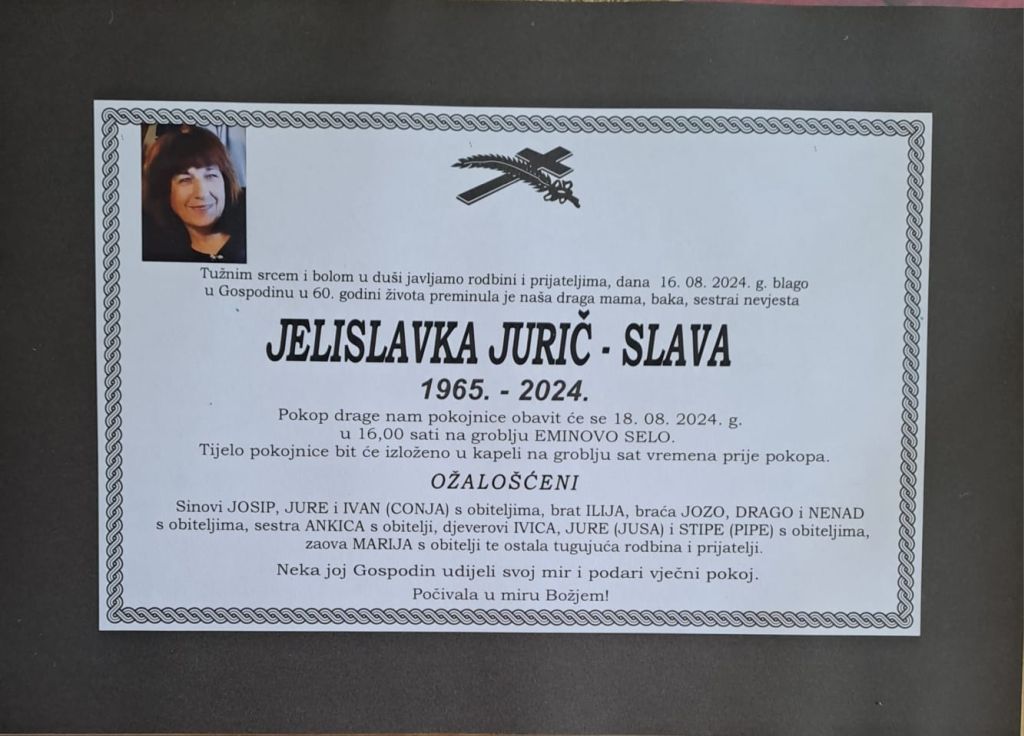 U petak, 16. kolovoza 2024. godine u 60. godini života blago u Gospodinu preminula je Jelislavka Jurič – Slava.