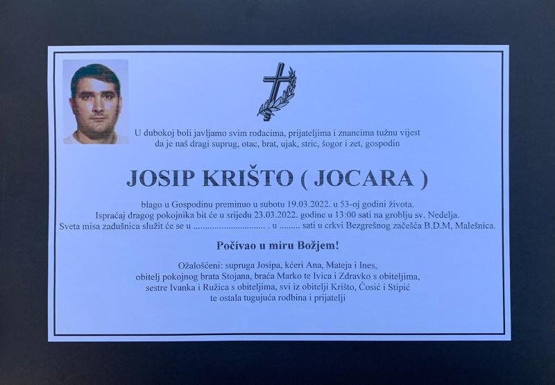 U subotu, 19. ožujka u 53. godini života blago u Gospodinu preminuo je Josip Krišto – Jocara.
