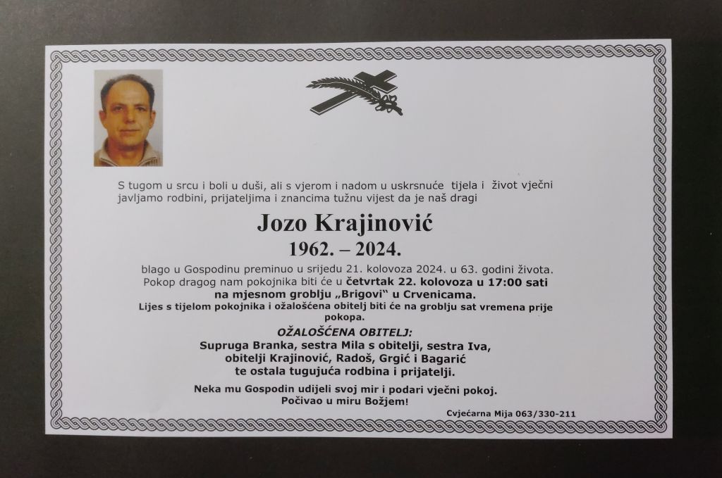 U srijedu, 21. kolovoza 2024. u 63. godini života blago u Gospodinu preminuo je Jozo Krajinović.